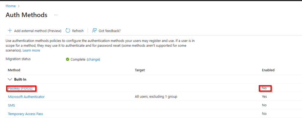 2. Enable the FIDO2 Authentication method in Microsoft Entra