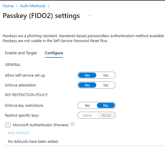 These are the settings I used for this scenario. If this is your first time setting up FIDO2 keys, I wouldn’t recommend enabling key restrictions just yet. There are tools available to identify the AAGUID on your FIDO2 keys, but let’s keep things simple for now.