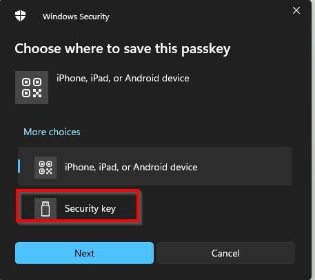 6. If you’re prompted with other options instead of the key, select Use another device and choose Security key, then click Next.